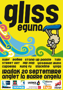 La treizième édition de Glisseguna aura lieu le dimanche 20 septembre 2015 au skate park de la Barre à Anglet. Glisseguna se veut être une rencontre entre l’univers de la glisse et la langue basque. Son ambition est en effet de promouvoir des sports tels que le surf, le roller, le skate etc. Vous pouvez télécharger le programme